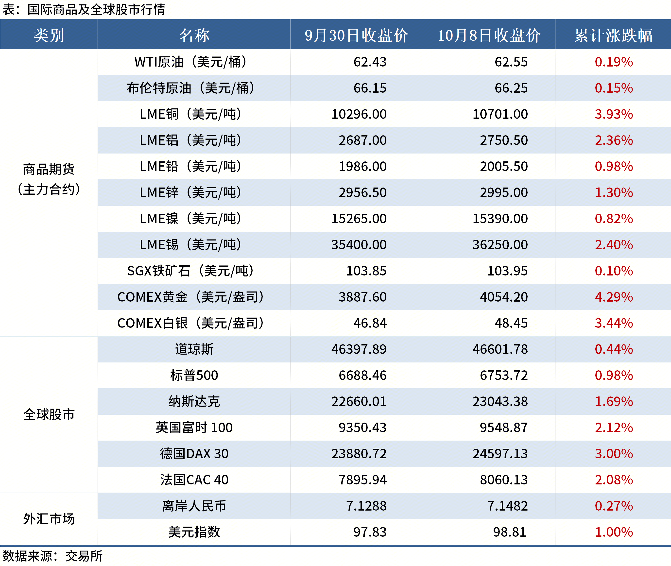 (6) Iron Ore: The iron ore market remained relatively sluggish during the National Day holiday period, with overseas swaps fluctuating narrowly. Meanwhile, import iron ore spot and forward price indices continued to trade largely stable. Looking ahead to the post-holiday market, most industry participants believe that although steelmakers may see some concentrated restocking demand, this impact is expected to be relatively short-lived. As a result, both indices and premium prices are likely to shift toward a weaker trend. For details>>